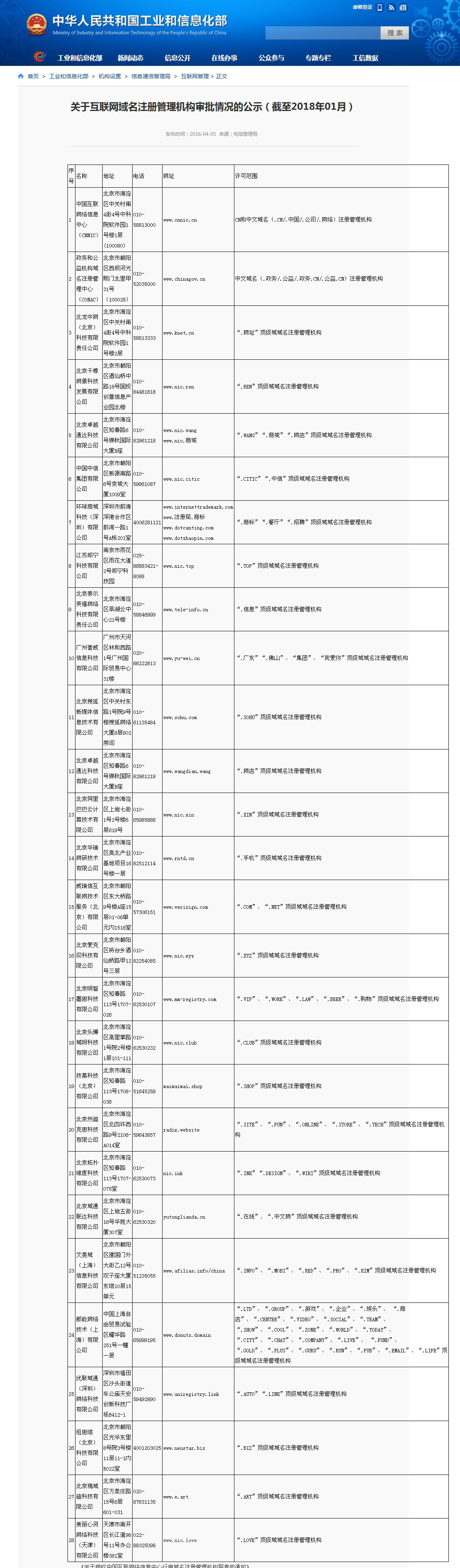 关于互联网域名注册管理机构审批情况的公示(截至2018年01月)