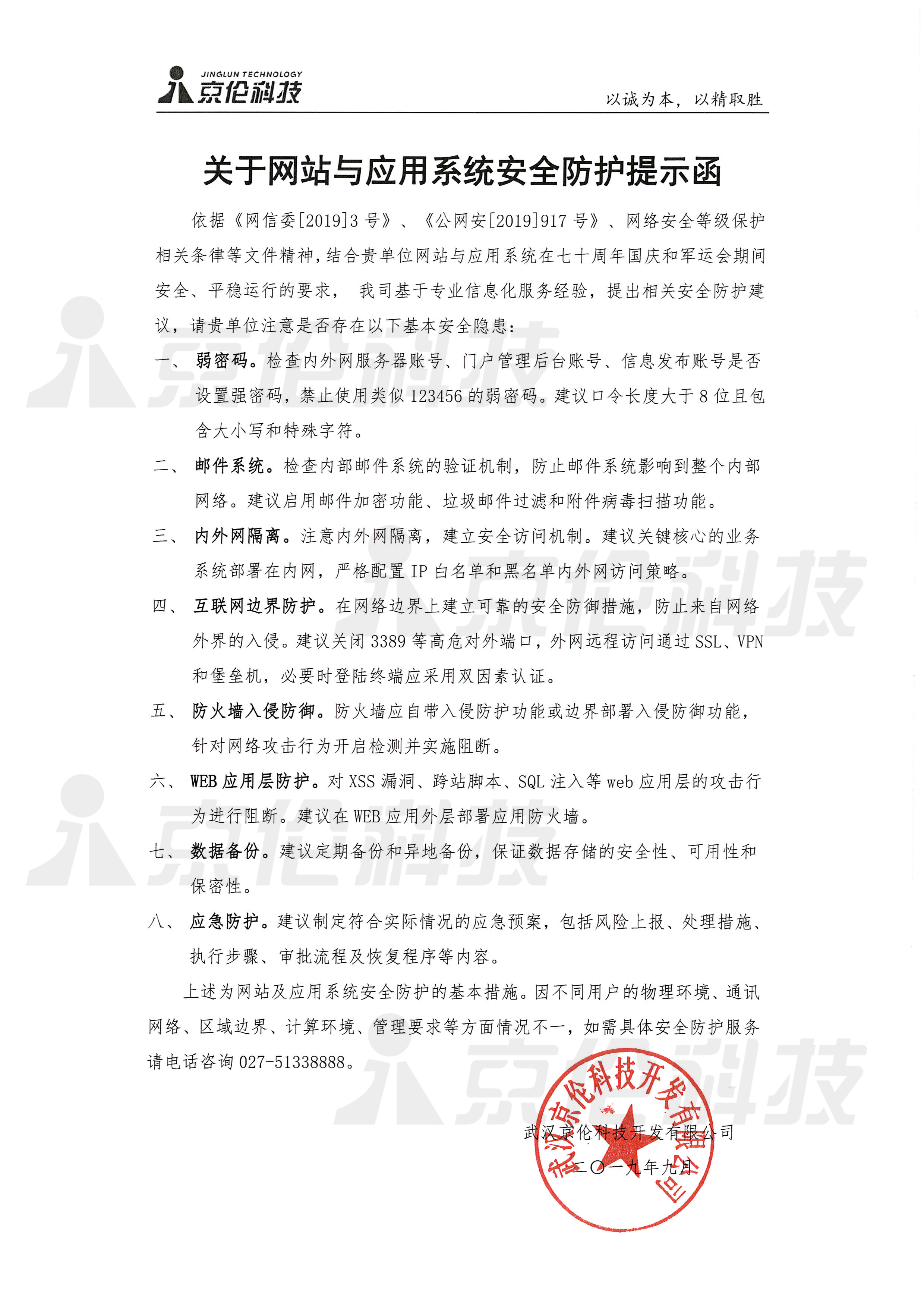 依据《网信委[2019]3号》、《公网安[2019]917号》、网络安全等级保护相关条律等文件精神,结合各单位网站与应用系统在七十周年国庆和军运会期间安全、平稳运行的要求,我司基于专业信息化服务经验,提出相关安全防护建议,详情请见《关于网站与应用系统安全防护提示函》。