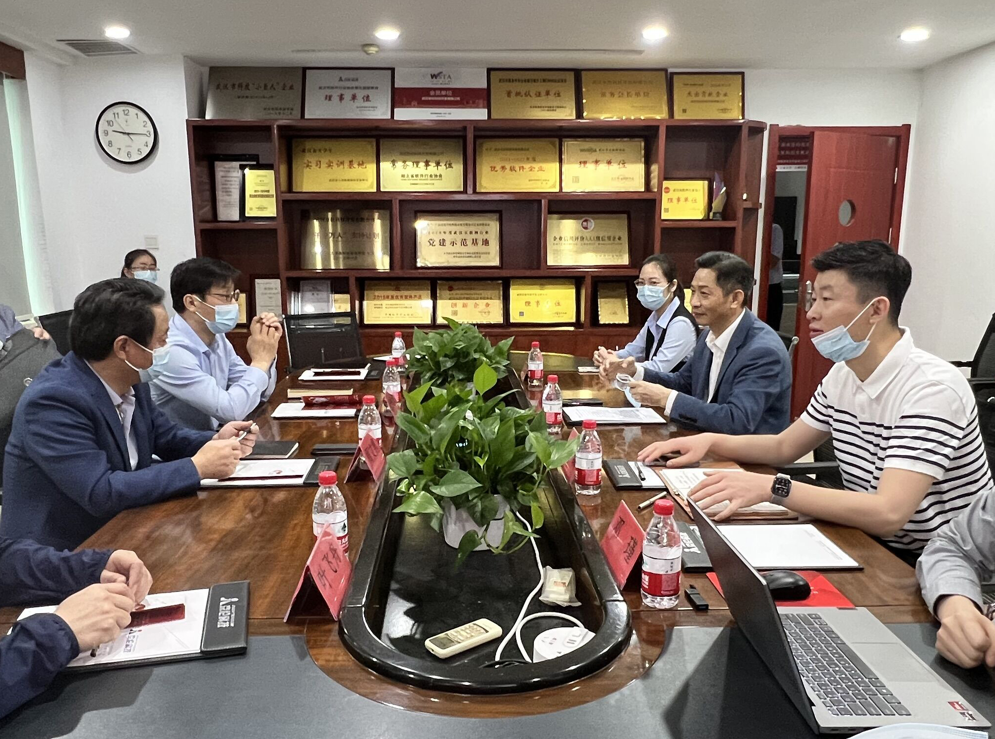 ? ? ? ?武昌区政协副主席金建涛一行领导实地踏看企业办公场地,党建阵地,观看企业产品展示,详细了解企业的业务发展情况,并与我司企业代表座谈。